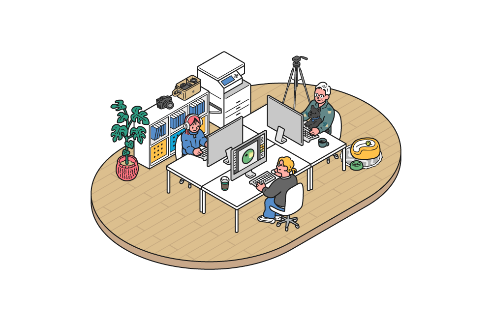 企画・営業〜発送までの様子を描かせていただきました。アイソメイラストは、可愛らしい雰囲気が出せるように、コロッとしたフォルムを心掛けました。今年はお髭がある方を描かせていただくことが多く、幅を広げていただきました^ ^